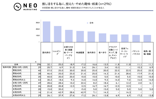 推し活のために削った趣味・娯楽は「国内旅行」が32.1%でトップに。交通費・宿泊費といった高額支出を真っ先にスリム化する姿が浮かびます。