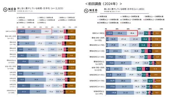 今回の月平均"推し活時間"は、「1時間未満」「1時間以上〜5時間未満」のライト層が41.0%と、2024年調査の38.1%から2.9ポイント増えました。全体としては依然、月10時間未満が約60%で、大枠の分布に大きな変化はありませんが、「短時間化」への傾斜がわずかに進んでいます。