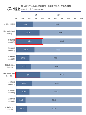 推し活のために他の趣味・娯楽を控えた・やめた経験は、全体で25.1%でした。つまり4人に1人が"資源のシフト"を経験しており、推し活が生活の優先順位を左右する存在になっていることがうかがえます。