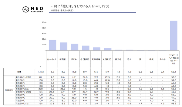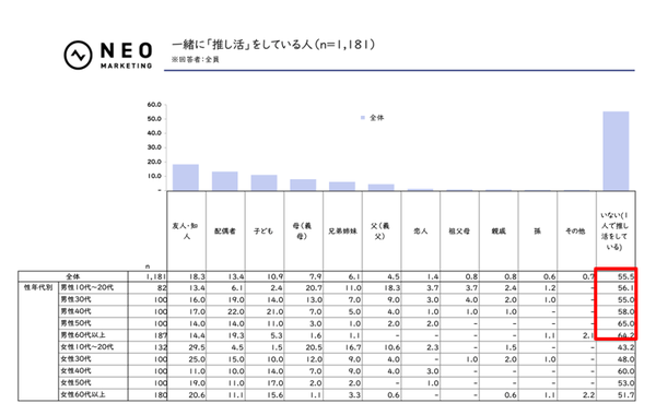 今回、"一人推し活"層(「いない(1人で推し活をしている)」と回答した層)は55.5%と、2024年比+2.4ポイントでわずかに増加しました。一方、「友人・知人」「配偶者」「子ども」とおこなう割合は変動が1ポイント未満で、あまり変化がない状況です。