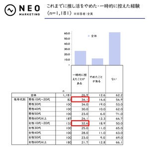 また、「一時的に控えたことがある」割合は、ほぼ全ての年代において男性の方がより高い傾向にあります。全体的に男性の方が"一人推し活"比率が高いこともあり、周囲に共有しづらくモチベーションを保ちにくい可能性が考えられると分析されています。