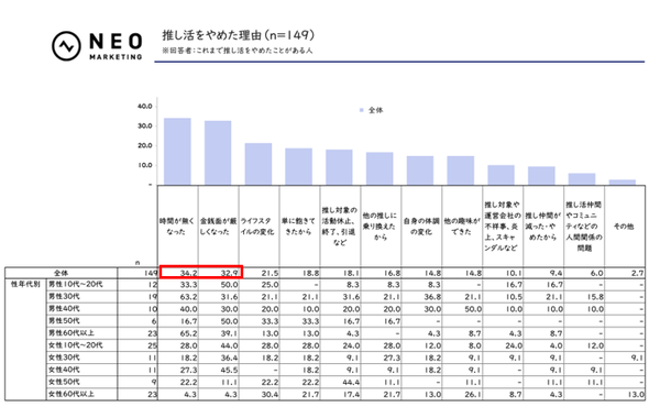 対して、女性50代は14.0%、男性50代も20.0%にとどまり、中高年層では推し活が既存の趣味を圧迫するほどではないようです。