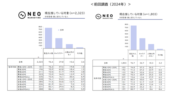 今回の調査でも推し対象は「実在の人物」が76.4%で最多となり、2024年調査(76.7%)と比べてもほぼ横ばいでした。キャラクターは37.8%と+1.1ポイントの小幅増にとどまり、若年層ほど高い傾向にあるという構図も変わっていません。