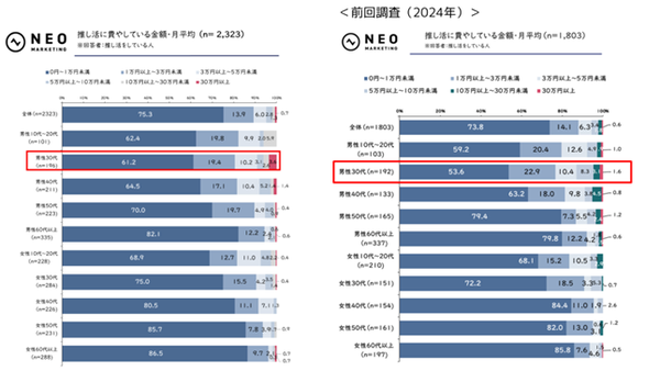一方で男性10~20代では10万円以上30万円未満(「10万円以上~30万円未満」「30万円以上」の合算)が5.9%と昨年比+4.0ポイントと健闘しており、"推しへの投資"の熱量は若年層に依然残っているようです。