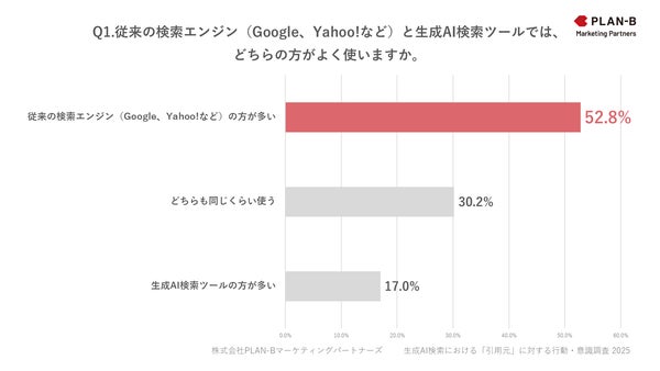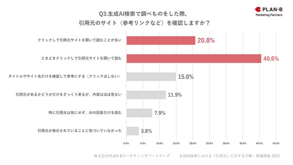 SEOを中心としたデジタルマーケティング支援を展開する株式会社PLAN-Bマーケティングパートナーズ(東京都品川区、代表取締役:鳥居本 真徳)は、生成AIを検索ツールとして利用した経験のあるユーザー394名を対象に『生成AI検索における「引用元」に対する行動・意識調査』を実施したことが発表されました。