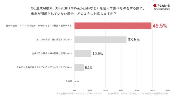 「Q6. 生成AI検索(ChatGPTやPerplexityなど)を使って調べものをする際に、出典が明示されていない場合、どのように対応しますか?」という質問では、「従来の検索エンジンで補完・裏取りを行う」と答えた人が49.5%と最も多く、「気にはなるが、特に裏取りはしない」(33.5%)、「出典がない時点でAIの回答は信用しない」(10.9%)と続きました。