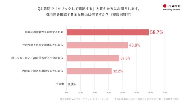 続いて、前問で「クリックして確認する」と答えた方に「Q4. 引用元を確認する主な理由は何ですか?(複数回答可)」と質問したところ、最も多かった理由は「出典元の信頼性を判断するため」で58.7%に達しました。そのほかは「元の文脈を自分で確認したい」(43.8%)、「詳しく知りたい・AIの回答が不十分だから」(37.6%)、「内容の正確さを裏取りしたい」(32.2%)と続き、AIの回答を鵜呑みにせず、自分自身で出典や文脈を確認しようとするユーザーが多いことが浮き彫りになりました。