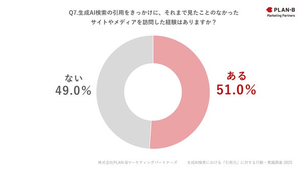 「Q7. 生成AI検索の引用をきっかけに、それまで見たことのなかったサイトやメディアを訪問した経験はありますか?」という質問では、「ある」と答えた人が51.0%に達し、「ない」(49.0%)をわずかに上回る結果となりました。