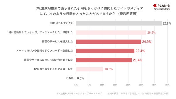 「Q8. 生成AI検索で表示された引用をきっかけに訪問したサイトやメディアにて、次のような行動をとったことがありますか?」という質問では、「特に何もしていない」が32.8%と最も多い回答でしたが、「商品やサービスを購入した」が24.9%、「メールマガジンや資料をダウンロード・登録した」が22.4%、「問い合わせをした」が21.4%と、何らかの具体的アクションにつながった事例が一定数確認できました。