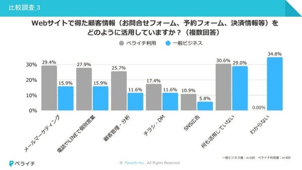 顧客情報の活用方法については、「メールマーケティング」が具体的手法の中で最も多く、ペライチ利用層では29.4%、一般ビジネス層では15.9%という結果でした。次いで「電話やLINEで個別営業」がペライチ利用層で27.9%、一般ビジネス層で15.9%、「顧客管理・分析」がペライチ利用層で25.7%、一般ビジネス層で11.6%となっています。