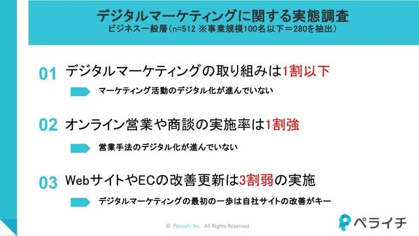 ノーコードでホームページ作成や様々なビジネス機能を提供する株式会社ペライチ(本社:東京都台東区、代表取締役CEO:藤本旬)は、「マーケティング活動のデジタル化に関する実態調査」を実施し、中小企業におけるデジタルマーケティング活動の実態を明らかにしています。事業規模100名以下の中小事業者を対象とした調査の結果、一般ビジネス層におけるデジタルマーケティング活動の実施率は1割以下である一方、ペライチ利用層ではマーケティング活動のデジタル化が大きく進んでいることが判明しました。