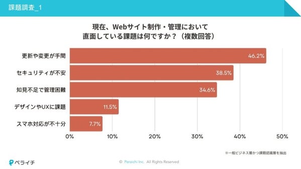 Webサイト制作・管理における最大の課題は「更新や変更が手間」。セキュリティや知識不足による管理困難な面も浮き彫りに
