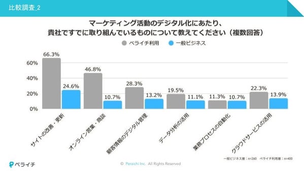 ビジネス一般層におけるデジタルを活用したマーケ活動は1割以下。サイト改善・更新は3割弱。ペライチ利用層はすべての項目で一般層よりも取り組み割合が高い