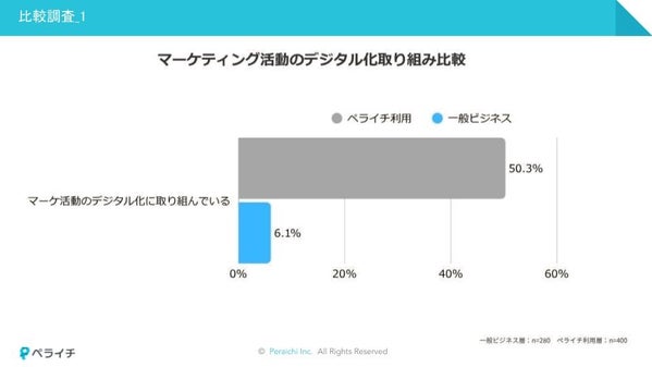 調査した6つの取り組み項目全てにおいて、ペライチ利用層の比率が高くなっており、特に「マーケティング活動のデジタル化」においては、ペライチ利用層が50.3%に対し、一般ビジネス層は6.1%と大きな差が見られました。このことから、ペライチを利用している企業ではマーケティング活動のデジタル化が大きく進んでいると考えられます。