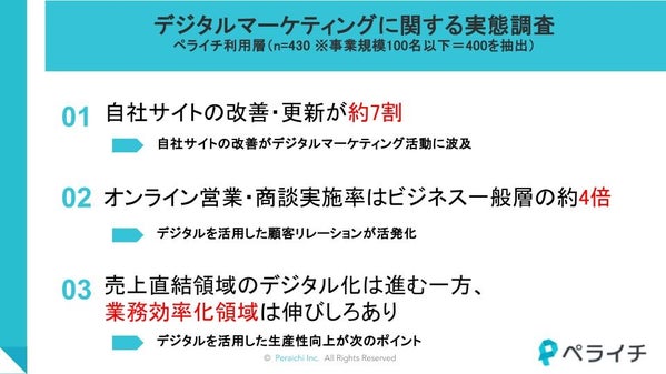 今回の調査から、マーケティング活動のデジタル化に取り組んでいる中小企業は全体の約1割にとどまることが明らかになりました。一方で、ペライチを利用している中小企業では、自社Webサイトの改善・更新だけでなく、顧客情報を適切に管理しながらオンライン営業やメール、SNSなどを活用したデジタルマーケティングに積極的に取り組んでいる様子が見られます。