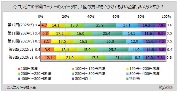 コンビニスイーツ購入者が1回の買い物でスイーツにかけてもよいと考える金額は、「250円~300円未満」がボリュームゾーンとなっています。