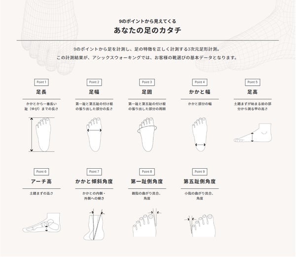 この詳細な計測データを基に、アシックスウォーキングの専門スタッフがお客様のニーズに合わせて最適な靴を提案します。「INFOOT 2」はアシックスウォーキング直営店の全店舗に設置されており、どなたでも無料で利用することができます。正確な足形データに基づいた靴選びにより、歩行時の快適さと健康をサポートしています。