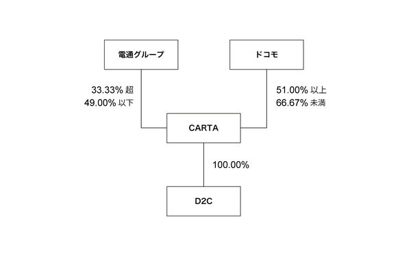 なお、現在、NTTドコモは、CARTA HOLDINGS株式および本新株予約権を所有していません。また、現在において、電通グループがD2C株式46.00%、NTTドコモがD2C株式51.00%、株式会社エヌ・ティ・ティ・アドがD2C株式3.00%を所有しています。