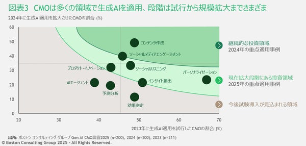経営コンサルティングファームのボストン コンサルティング グループ(以下、BCG)がアジア、欧州、北米におけるさまざまな業界の最高マーケティング責任者(CMO) 200人を対象に実施した生成AI調査の結果が発表されました。「How CMOs Are Scaling GenAI in Turbulent Times」と題されたこのレポートは、2023年、2024年と続けて行われた調査の最新結果をまとめたものとなっています。