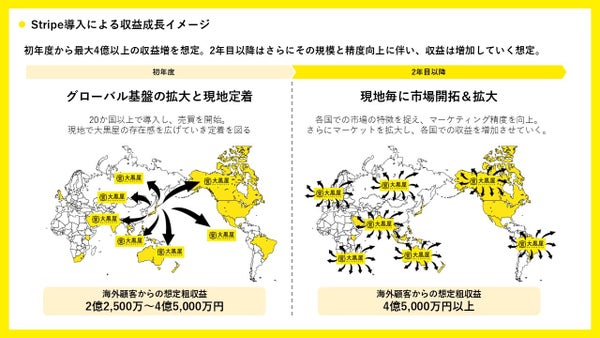 Stripeの導入により、海外顧客の利便性向上や決済のシームレス化を実現し、年間3,000万~1億円の追加利益が生じる試算となっています。2年目以降はさらなる規模と精度の向上を目指し、より高い収益を見込んでいるようです。