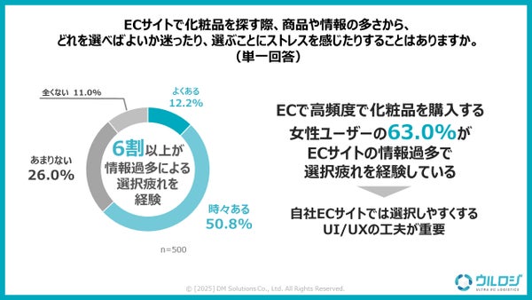 ECサイトの利点の一つである豊富な品揃えが、ユーザーにとって新たな課題をもたらしている実態も明らかになりました。ECにて高頻度で化粧品を購入する女性ユーザーの63.0%が、ECサイトの情報過多により「選択疲れ」を経験していることが判明しています。「よくある」(12.2%)と「時々ある」(50.8%)を合わせると、6割以上のユーザーが、多くの選択肢の中から自分に合う商品を効率的に見つけ出すプロセスにストレスや負担を感じていることが分かります。