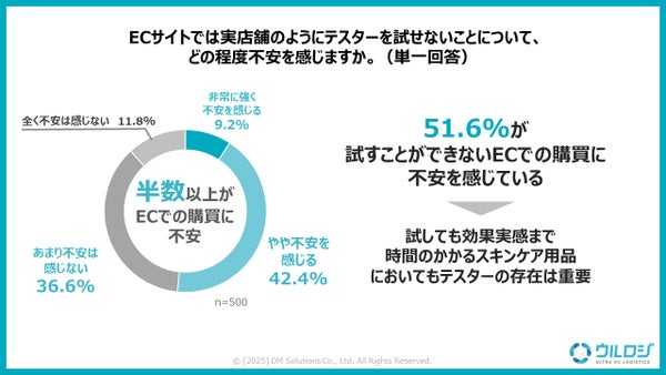ECサイトでの化粧品購買における最も大きな課題の一つが「実店舗のようにテスターを試せないこと」に対する不安です。調査によると、回答者の半数以上(51.6%)がこの点に不安を感じていることが明らかになっています。「非常に強く不安を感じる」が9.2%、「やや不安を感じる」が42.4%を占めており、多くのユーザーにとって、ECでの化粧品購入には心理的なハードルが存在することが分かります。
