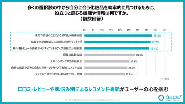 この「選択疲れ」を軽減し、自分に合う化粧品を効率的に見つけるために役立つと感じる機能や情報について尋ねたところ、ユーザーが重要視しているのは、「成分や肌悩みなどによる絞り込み検索機能」(38.2%)、「信頼できる情報源による製品比較やランキング」(37.2%)、「購入者レビューの要約やポジティブ/ネガティブ意見の分類表示」(36.4%)であることが分かりました。これらの結果は、UI(ユーザーインターフェース)およびUX(ユーザーエクスペリエンス)の工夫が極めて重要であることを明確に示唆しています。