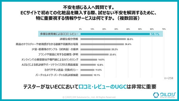 このことから、テスターという物理的な体験ができないECにおいて、他のユーザーの「生の声」、すなわちUGC(User Generated Content)が、商品の信頼性や実際の使用感を伝え、不安を払拭するための最も強力かつ有効な代替手段となっていることが強く示唆されています。