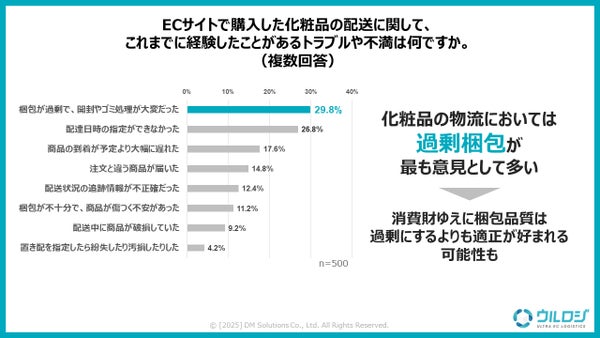 ECサイトで購入した化粧品の配送体験も、顧客満足度やリピート意向に影響を与える重要な要素です。これまでに経験したトラブルや不満について尋ねたところ、ユーザーから寄せられた様々な意見の中で最も多かったのは、「梱包が過剰で、開封やゴミ処理が大変だった」という点で、29.8%のユーザーがこれを経験していることが明らかになりました。次いで、「配達日時の指定ができなかった」(26.8%)、「商品の到着が予定より大幅に遅れた」(17.6%)などが挙げられています。
