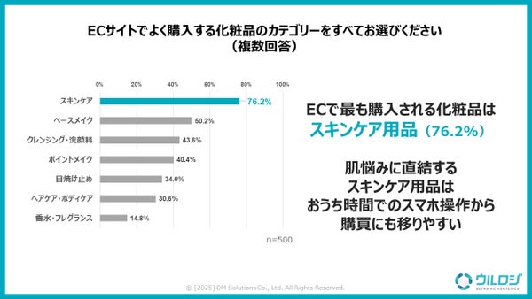 EC物流代行(発送代行)サービス「ウルロジ」を運営するディーエムソリューションズ株式会社(本社:東京都武蔵野市、代表取締役社長:花矢卓司)が、全国の20-40代の女性で日常的にコスメ・化粧品をECで購入している500名を対象とした「コスメ・化粧品のECでの購買課題に関する実態調査」の結果を発表しました。