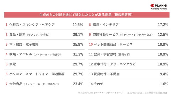 生成AIをきっかけに購入経験がある人を対象に「Q2. 生成AIとの対話を通じて購入したことがある商品」を複数選択形式で質問したところ、「化粧品・スキンケア・ヘアケア」が最多で40.6%、次いで「食品・飲料(サプリメント含む)」が39.1%、「本・雑誌・電子書籍」が35.9%となりました。
