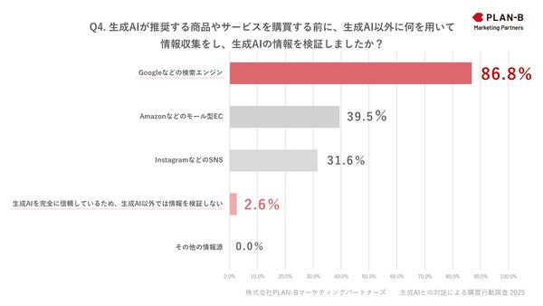 生成AIをきっかけに購買・行き先決定の経験がある人を対象に「Q4. 生成AIが推奨する商品やサービスを購買する前に、何を用いて情報を検証しましたか?」と質問したところ、「Googleなどの検索エンジン」が86.8%で圧倒的多数となりました。次いで「Amazonなどのモール型EC」(39.5%)、「InstagramなどのSNS」(31.6%)と続きました。一方で、「生成AIを完全に信頼しているため、検証しない」と回答した人はわずか2.6%でした。