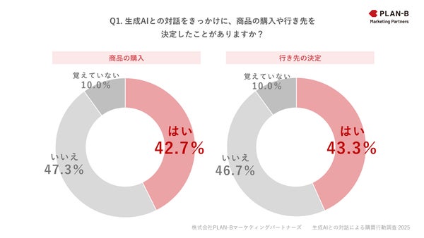 「Q1. 生成AIとの対話をきっかけに、商品の購入や行き先を決定したことがありますか?」という質問に対し、「商品の購入」を決定したことがある人は42.7%、「行き先(旅行先、レストランなど)」を決定したことがある人は43.3%という結果になりました。