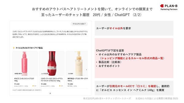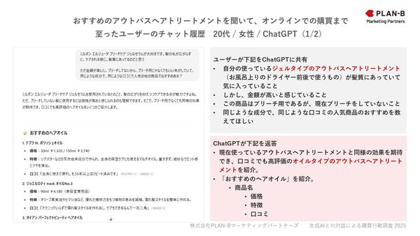 また、PLAN-Bマーケティングパートナーズが社内で同様に行った調査からは、購入に至った際の実際のAIとのチャット履歴も一部公開されています。