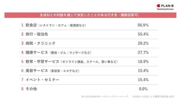 また、生成AIをきっかけに行き先を決定したことがある人を対象に「Q3. 決定したことがある行き先」を複数選択形式で質問したところ、「飲食店(レストラン・カフェ・居酒屋など)」が56.9%、「旅行・宿泊先」が55.4%と、この2項目が半数を超える結果となりました。次いで「病院・クリニック」が29.2%でした。