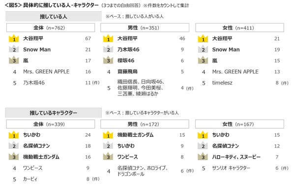 具体的な推しの人物やキャラクターについても調査が行われました。推しの人物では、「大谷翔平」が男女ともに高い人気を集めており、女性に特に人気があるのは「Snow Man」や「嵐」などのグループであることが明らかになっています。