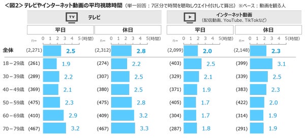 調査では平日・休日別に7区分で動画視聴時間を聴取し、平均値を算出しています。テレビの視聴時間は平日が2.5時間、休日が2.8時間となっており、年齢が高くなるほど視聴時間が長くなる傾向が見られました。特に60~70代では休日・平日ともにほぼ3時間テレビを視聴していることが分かっています。