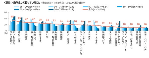 調査では53項目の趣味を提示して確認を行った結果、最も人気のある趣味のトップ5は「テレビを観る・ラジオを聴く」「旅行・行楽」「音楽鑑賞」「動画共有サービスを観る」「読書をする」となりました。