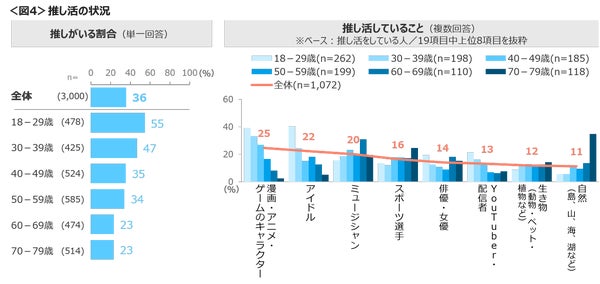 調査によると、推し活(特定の人物やキャラクターなどを応援する活動)を行っている人は全体の36%にのぼることが分かっています。年代別に見ると、若年層ほど推し活実施率が高く、18~29歳では55%、30代では47%となっています。