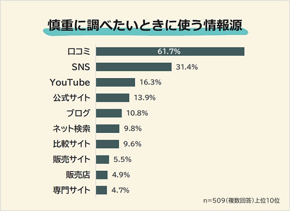 慎重に商品を調査する際に利用する情報源としては「口コミ(61.7%)」が圧倒的に多く、全体の6割以上を占める結果となりました。2位は「SNS(31.4%)」で、3割以上の回答者が選択しています。