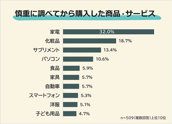 実際に慎重に調査してから購入した商品・サービスについて尋ねたところ、最も多かった回答は「家電(32.0%)」でした。