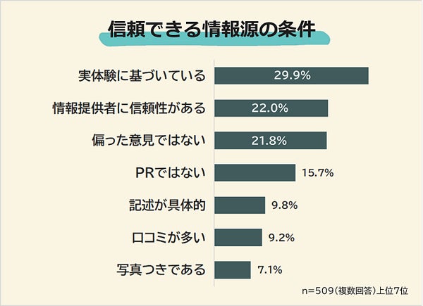 「信頼できる情報源の条件は何か」という問いに対しては、「実体験に基づいている(29.9%)」という回答が最も多く寄せられました。