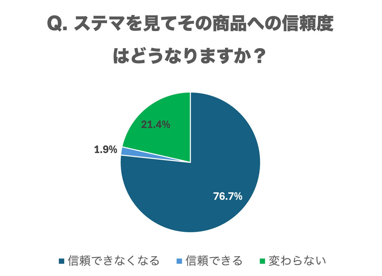 同様に、ステマを見た後の商品への信頼度についても、「信頼できなくなる」と回答した人が76.7%と多数を占め、「信頼できる」は1.9%、「変わらない」は21.4%でした。この結果から、インフルエンサーが独自の判断でステマを行った場合でも、商品自体の信頼度は大きく低下する可能性が高いことが示されています。