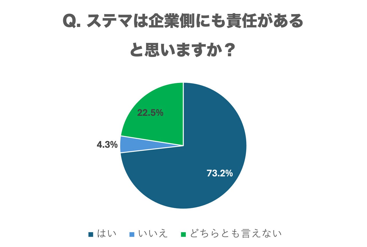 ステマは企業側にも責任があると思うかという質問には、「はい」と回答した人が73.2%と多数を占め、「いいえ」は4.3%、「どちらとも言えない」は22.5%でした。この結果から、企業側がPR表記なしに関与していなかった場合でも、消費者の多くは企業にも責任があると考えており、ステマと認識されることで企業イメージも悪化する可能性が高いことが示されています。