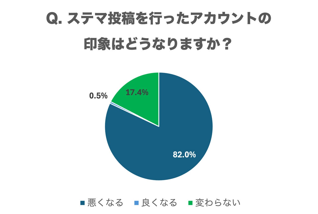 調査結果によると、ステマ投稿を行ったアカウント(企業やインフルエンサー)への印象については、「悪くなる」が82.0%と圧倒的多数を占め、「良くなる」はわずか0.5%、「変わらない」は17.4%となっています。