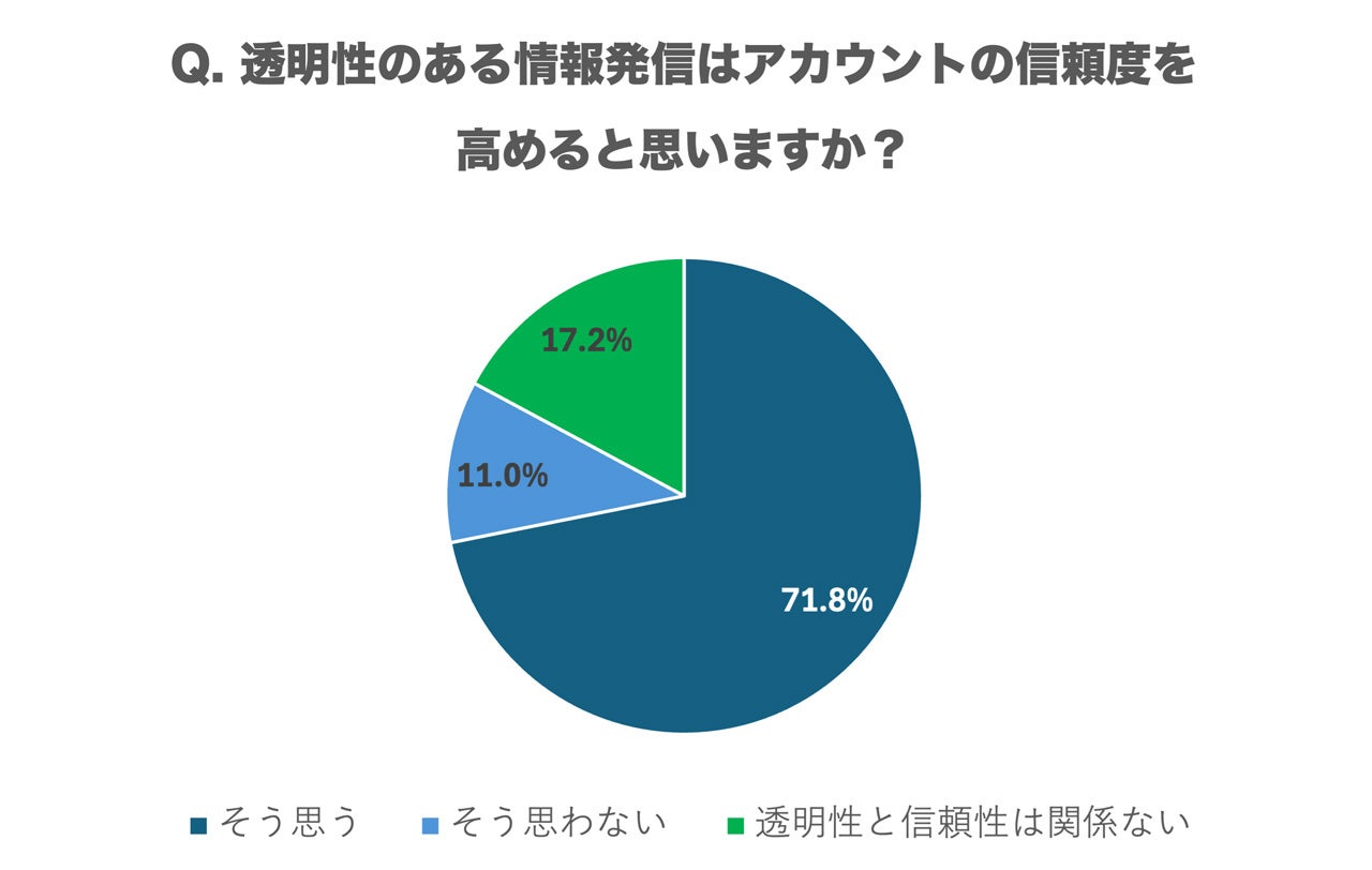 透明性のある情報発信がアカウント(企業やインフルエンサー)の信頼度を高めると思うかという質問には、「そう思う」と回答した人が71.8%と多数を占め、「そう思わない」は11.0%、「透明性と信頼性は関係ない」は17.2%でした。