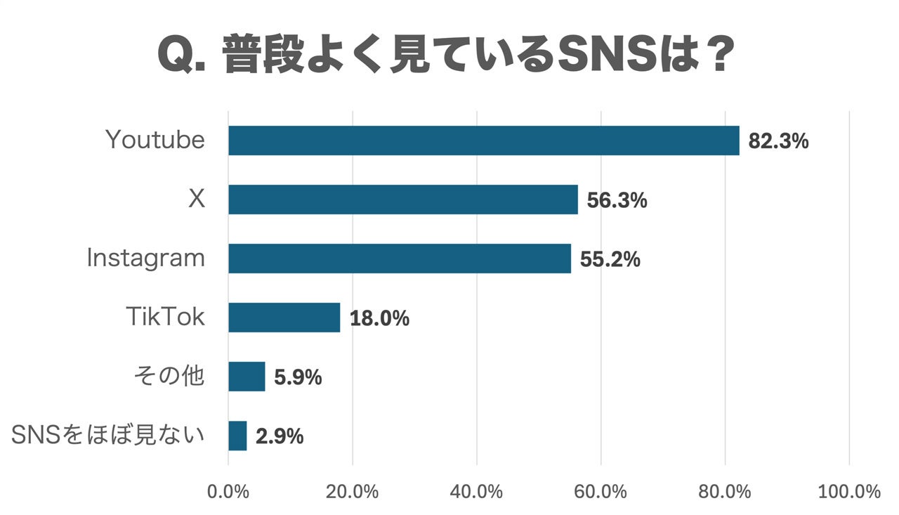 調査結果によると、回答者が普段よく利用しているSNSについては、YouTube(82.3%)が最も高い利用率を示し、X(旧Twitter)(56.3%)とInstagram(55.2%)が続いています。TikTokの利用率は18.0%で、SNSをほぼ見ないという回答者は2.9%に留まっています。