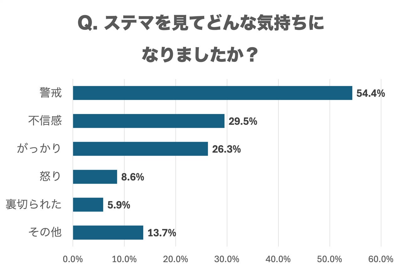 調査によると、ステマを見た際の感情については、「警戒」(54.4%)が最も多く、「不信感」(29.5%)、「がっかり」(26.3%)と続いています。「怒り」(8.6%)や「裏切られた」(5.9%)といった強い否定的感情も見られました。