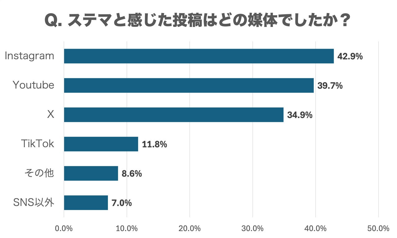 ステマと感じた投稿の媒体については、Instagram(42.9%)が最も多く、YouTube(39.7%)、X(34.9%)が続いています。TikTokは11.8%、その他のSNSが8.6%、SNS以外が7.0%という結果でした。普段利用しているSNSの割合と比較すると、Instagramでステマと感じる投稿に遭遇する確率が他のSNSより高いことが示唆されています。