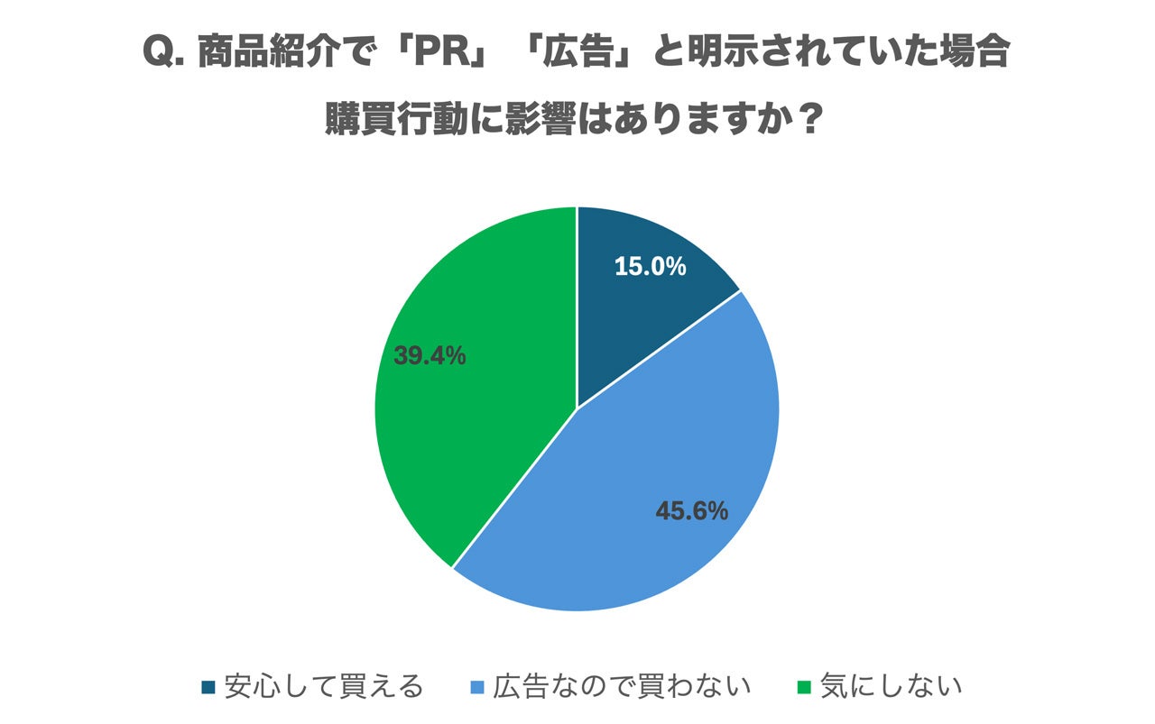 商品紹介で「PR」「広告」と明示されていた場合の購買行動への影響については、「広告なので買わない」と回答した人が45.6%と最も多く、次いで「気にしない」が39.4%、「安心して買える」が15.0%という結果でした。これは、企業がステマを選択する理由の一端を示していると考えられます。